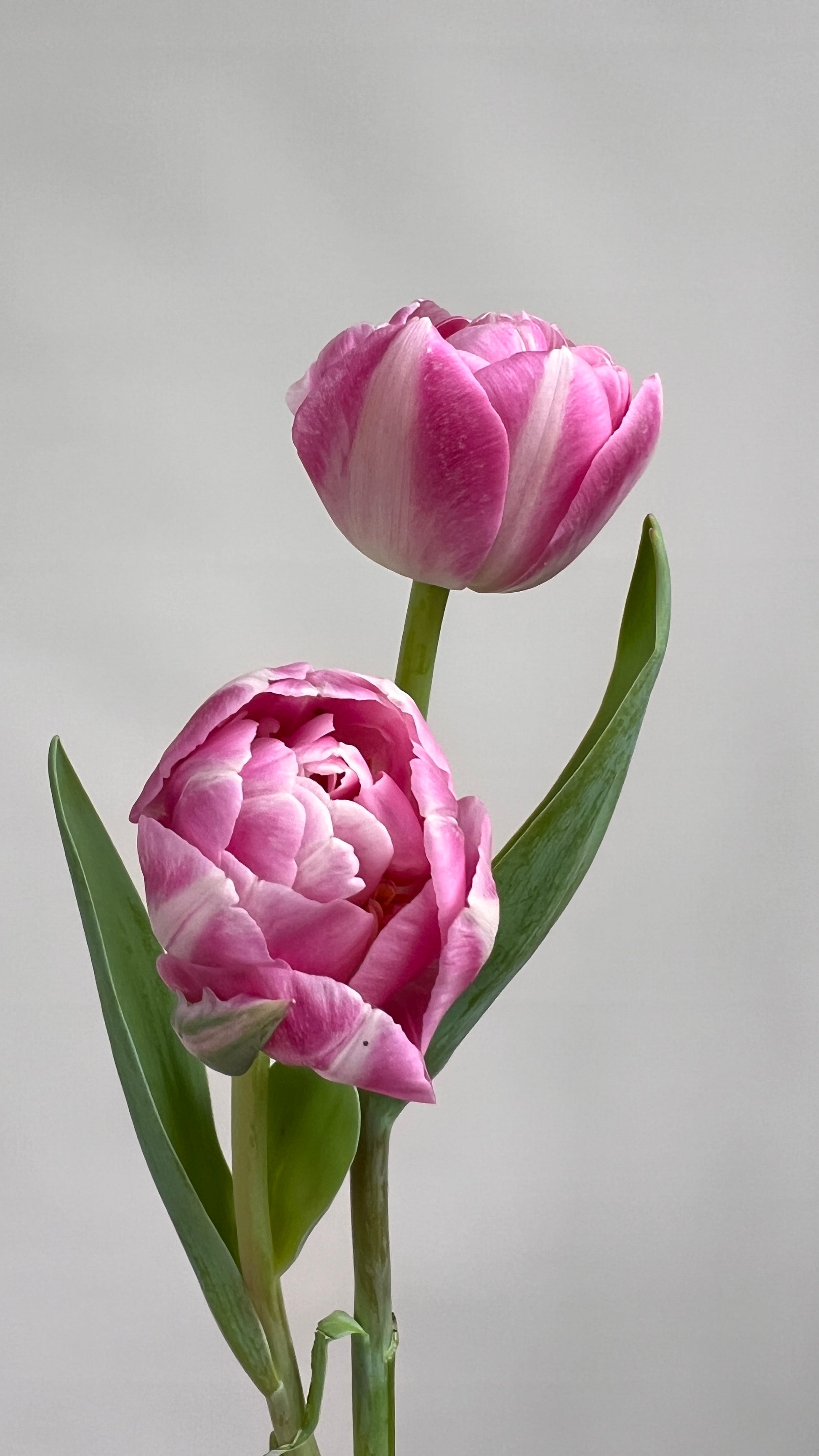 Huge double candy pink flowers that become lighter pink near the center. Like a big fluffy scoop of swirly ice cream. Stunning with Silver Cloud, Ronaldo or any lavender Triumphs. I like this one with peach, apricot or orange tones too!